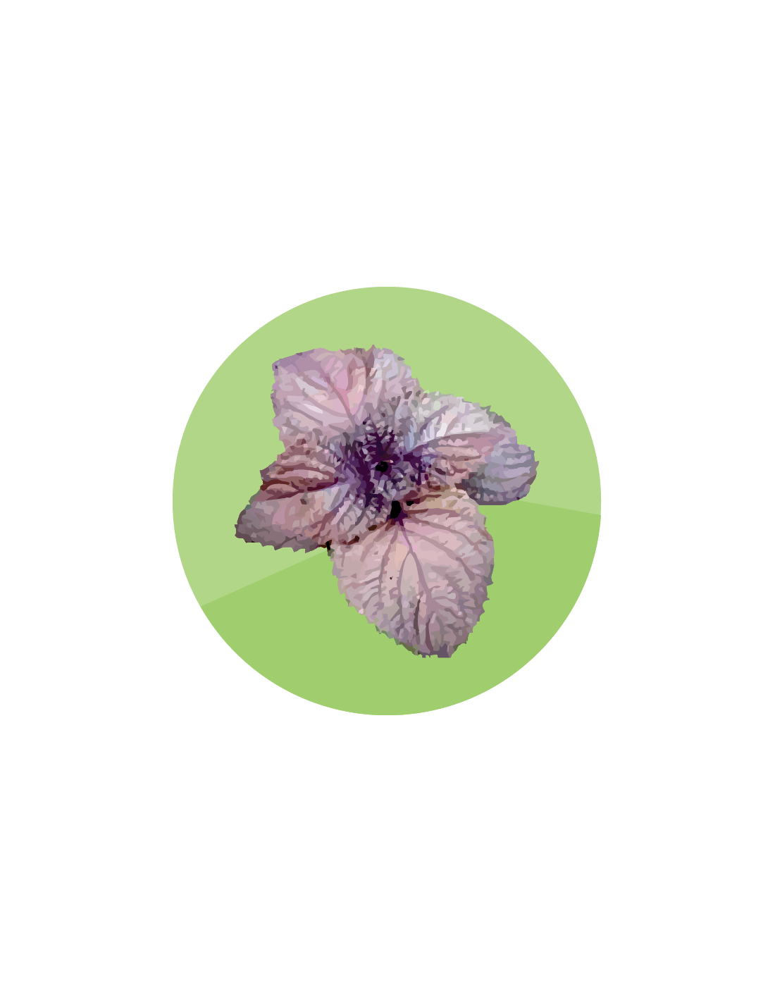 Hierba culinaria ampliamente utilizada en la cocina oriental, también conocida cómo albahaca japonesa. Sus hojas de color rubí y florcitas, ambas comestibles, sirven para condimentar ensaladas o para dar un toque de color y aroma a variados platos. En el oriente, es empleado para darle color a los pickles fermentados. Se trata su cultivo igual que a la albahaca.